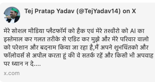 दरअसल, सोशल मीडिया पर वायरल हो रही फोटो के बारे में अब तेज प्रताप यादव ने इसे झूठा बताया है. उन्होंने सोशल मीडिया के X प्लेटफार्म पर लिखा कि उन्हें बदनाम किया जा रहा है. उनके सोशल मीडिया अकाउंट को हैक कर लिया गया है. उनकी तस्वीरों को AI का इस्तेमाल करके गलत तरीके से एडिट किया जा रहा है. साथ ही उन्हें और उनके परिवार को बदनाम किया जा रहा है. उन्होंने अपने शुभचिंतको और फॉलोवर्स से अपील की है कि वे सतर्क रहें और किसी भी अफवाह पर ध्यान न दें.