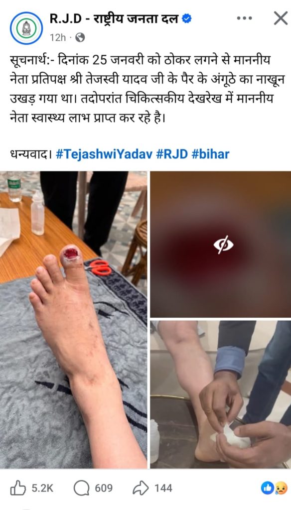 राजद ने फेसबुक पर पोस्ट करते हुए लिखा- “दिनांक 25 जनवरी को ठोकर लगने से माननीय नेता प्रतिपक्ष श्री तेजस्वी यादव जी के पैर के अंगूठे का नाखून उखड़ गया था। तदोपरांत चिकित्सकीय देखरेख में माननीय नेता स्वास्थ्य लाभ प्राप्त कर रहे है”।