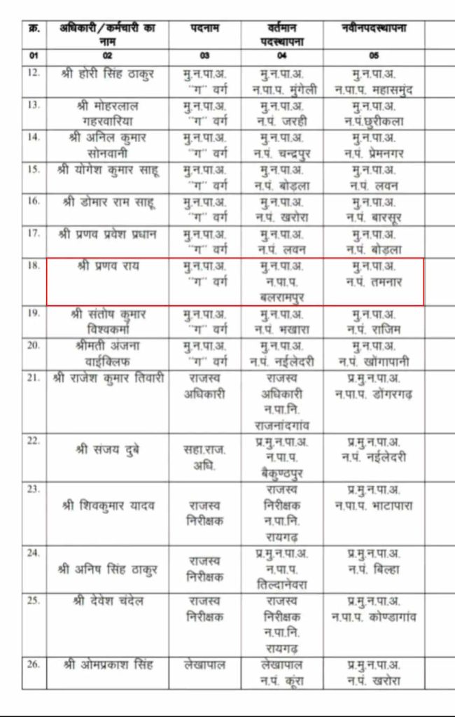 लगातार बढ़ते विवाद और जनप्रतिनिधियों में नाराजगी को देखते हुए अंततः राज्य शासन ने मामले में हस्तक्षेप किया। इसके बाद विवादित CMO प्रणव राय का बलरामपुर नगर पालिका से तमनार नगर पालिका में स्थानांतरण कर दिया है। पार्षदों और स्थानीय जनप्रतिनिधियों ने शासन के इस निर्णय का स्वागत करते हुए उम्मीद जताई है कि अब नगर पालिका में कार्य व्यवस्था सुचारु रूप से संचालित हो सकेगी।