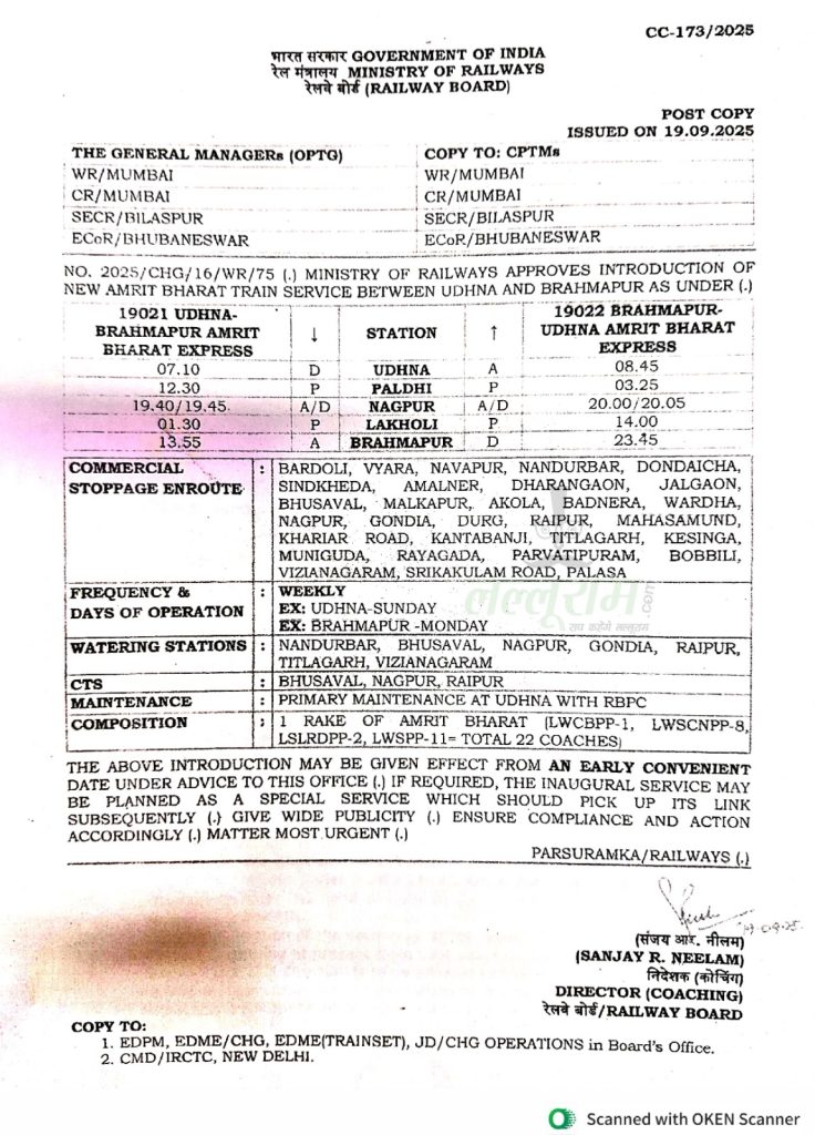 रोज सुबह 7:10 बजे उधना स्टेशन से ब्रह्मपुर के लिए प्रस्थान करेगी अमृत भारत ट्रेन