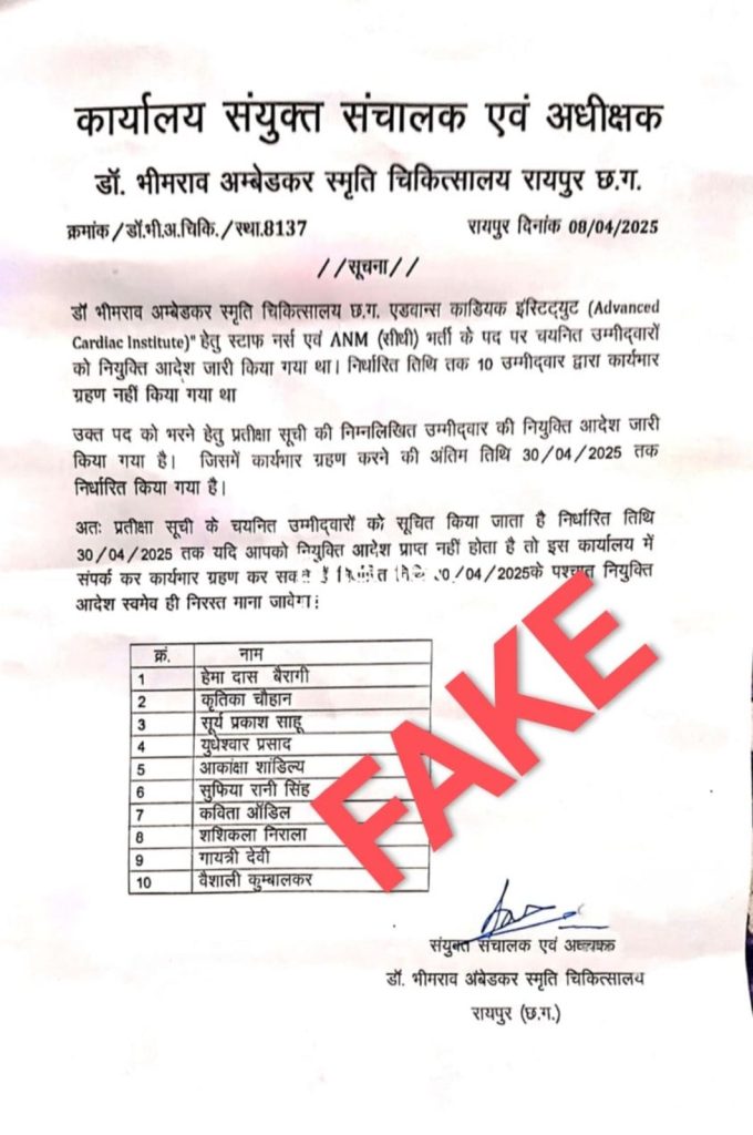 सत्यपाल राजपूत, रायपुर. राजधानी स्थित डॉ. भीमराव अम्बेडकर स्मृति चिकित्सालय ने सोशल मीडिया पर वायरल हो रहे भर्ती और नियुक्ति से जुड़े एक फर्जी पत्र को लेकर चेतावनी जारी की है. अस्पताल प्रबंधन ने स्पष्ट किया है कि एडवांस कार्डियक इंस्टिट्यूट में स्टाफ नर्स एवं एएनएम की भर्ती से जुड़ी कोई भी वैध सूचना फिलहाल अस्पताल द्वारा जारी नहीं की गई है.