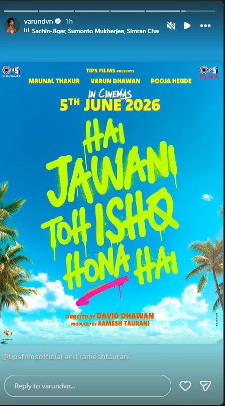 एक्टर वरुण धवन (Varun Dhawan) ने अपने इंस्टाग्राम की स्टोरी पर अपनी अपकमिंग फिल्म की एक फोटो शेयर किया है. फोटो में नारियल के पेड़ों के साथ बीच में लिखा फिल्म का नाम ‘है जवानी तो इश्क होना है’ (Hai Jawani Toh Ishq Hona Hai). इसके साथ ही सबसे ऊपर तीनों स्टार्स का नाम लिखा दिखाई दे रहा है. साथ ही बताया गया है कि ये फिल्म अब 5 जून 2026 को रिलीज होगी.