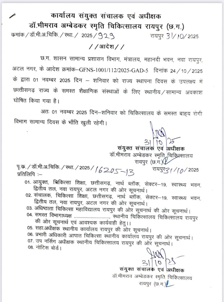 सत्या राजपूत, रायपुर। राज्य स्थापना दिवस के अवसर पर जहां एक ओर प्रदेशभर के सरकारी दफ्तरों और शैक्षणिक संस्थाओं में अवकाश घोषित किया गया है, वहीं राजधानी रायपुर स्थित राज्य के सबसे बड़े सरकारी अस्पताल डॉ.भीमराव अम्बेडकर स्मृति चिकित्सालय (मेकाहारा) में छुट्टी नहीं रहेगी। मरीजों की सुविधा को ध्यान में रखते हुए अस्पताल 1 नवंबर को भी पूर्व की भांति संचालित रहेगा।