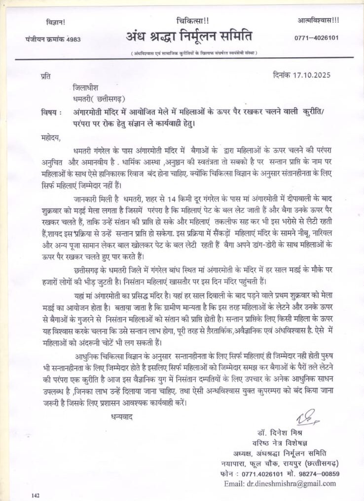 अंधश्रद्धा निर्मूलन समिति के अध्यक्ष डॉ. दिनेश मिश्र ने कहा कि धमतरी गंगरेल के पास अंगारमोती मंदिर में बैगाओं के दल द्वारा महिलाओं के ऊपर चलने की परंपरा अनुचित और अमानवीय है. धार्मिक आस्था, अनुष्ठान की स्वतंत्रता तो सबको है पर सन्तानप्राप्ति के नाम पर महिलाओं के साथ ऐसे हानिकारक रिवाज और कुरीतियों को बंद होना चाहिए. संतानहीनता के लिए सिर्फ महिलाएं जिम्मेदार नहीं हैं. इस सम्बन्ध में कलेक्टर धमतरी को पत्र लिख कर महिलाओं के ऊपर चलने की इस गलत परंपरा को बंद कराने की मांग की है.