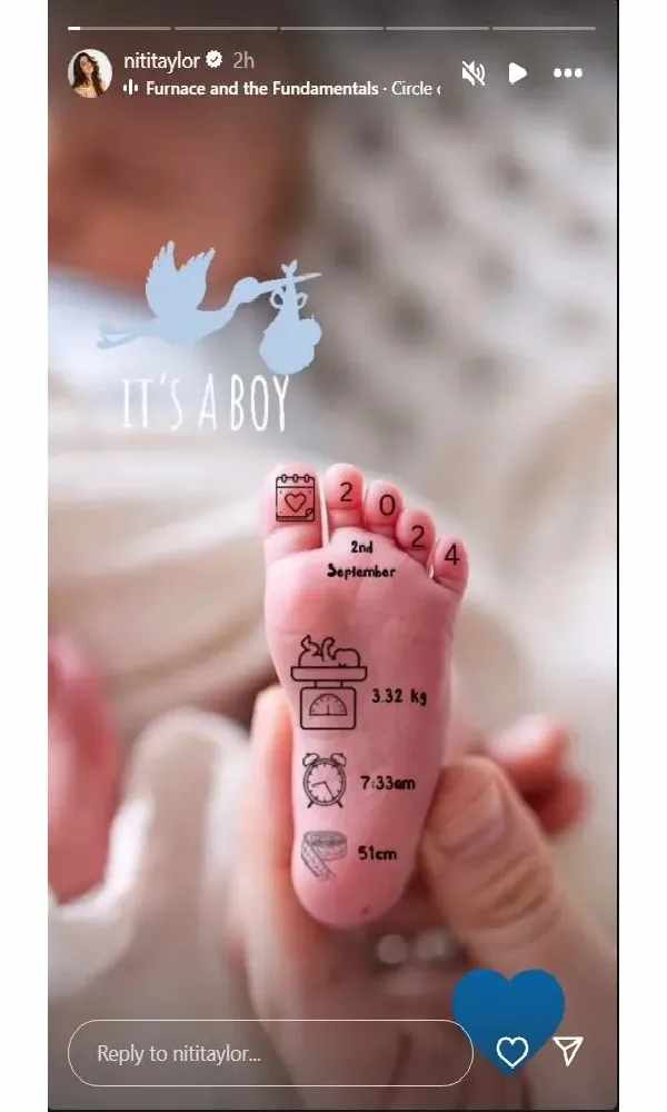 बता दें कि नीति टेलर (Niti Taylor) ने अपने इंस्टाग्राम स्टोरी पर बेबी के पैर की तस्वीर शेयर कर लिखा है कि लड़का हुआ है. इसके साथ ही उस बेबी के पैर पर 2 सितंबर 2024 की तारीख लिखी हुई है. जिसका मतलब है कि बेबी का जन्म 4 दिन पहले हुआ है. इसके साथ ही नीति टेलर (Niti Taylor) ने फैंस को बताया है कि बेबी 3.32 kg का है, उसका जन्म सुबह 7:33 बजे हुआ है और वो 51cm का है. Read More – Indias Best Dancer 4 के मंच पर Urfi Javed ने लगाई आग, Terence Lewis के साथ मारे लटके झटके …