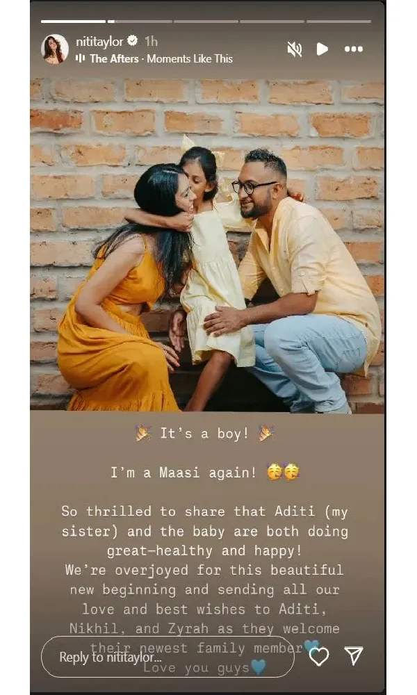 नीति टेलर (Niti Taylor) ने आगे लिखा, ‘हम इस खूबसूरत नई शुरुआत के लिए बेहद खुश हैं और अपना सारा प्यार और दुआएं अदिति, निखिल और जायरा को भेज रहे हैं क्योंकि उन्होंने अपने परिवार के नए मेंबर का स्वागत किया है. लव यू गाइस.’ इसके साथ ही एक्ट्रेस ने अपनी बहन की तस्वीरें भी शेयर की हैं. अब एक्ट्रेस मासी बनकर बहुत खुश हैं और अपनी इस एक्साइटमेंट का इजहार कर रही हैं. फैंस भी उन्हें बधाई दे रहे हैं.