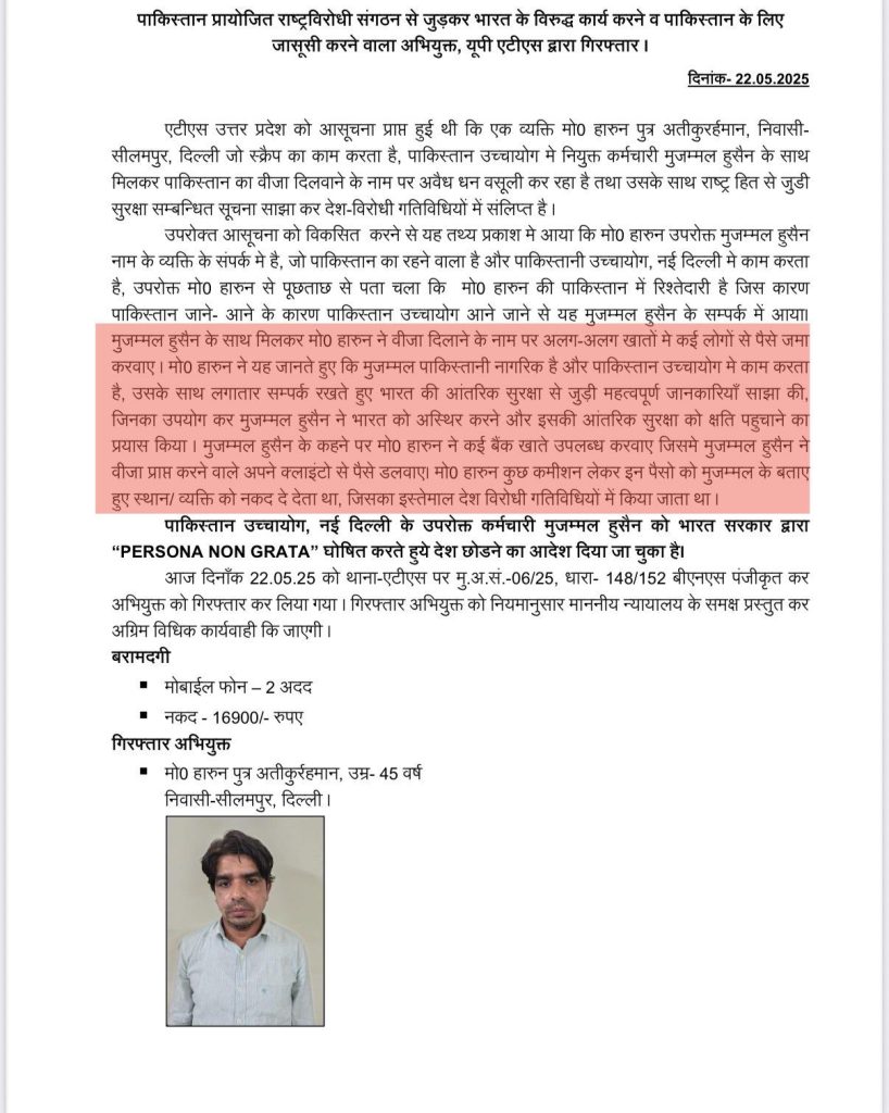 दिल्ली के सीलमपुर निवासी मोहम्मद हारून को गुरुवार को उत्तर प्रदेश आतंकवाद निरोधक दस्ता (एटीएस) ने गिरफ्तार किया है। मोहम्मद हारून दिल्ली में स्क्रैप का काम करता है। साथ ही उस पर पाकिस्तान उच्चायोग में नियुक्त कर्मचारी मुजम्मल हुसैन के साथ मिलकर पाकिस्तान का वीजा दिलवाने के नाम पर अवैध धन वसूली करने के साथ ही राष्ट्रहित से जुड़ी सुरक्षा संबंधित सूचना साझा करने का आरोप है। एटीएस ने केस दर्ज कर आगे की जांच शुरू कर दी है।