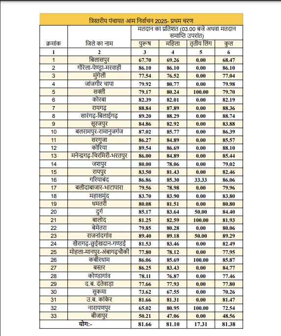 रायपुर। त्रिस्तरीय पंचायत चुनाव 2025 के प्रथम चरण का चुनाव 17 फ़रवरी को शांतिपूर्ण संपन्न हुआ . निर्वाचन आयोग के अधिकारियों ने बताया कि प्रथम चरण में राज्य के 53 विकासखण्डों में मतदान हुआ. 81 प्रतिशत से अधिक महिला एवं पुरूष मतदाताओं ने अपने मताधिकार का उपयोग किया. इस प्रकार राज्य में मतदान का औसत 81.38 प्रतिशत रहा. सभी जगहों में मतगणना भी शांतिपूर्ण संपन्न हुआ. कही कोई अप्रिय घटना की शिकायत नहीं आई.