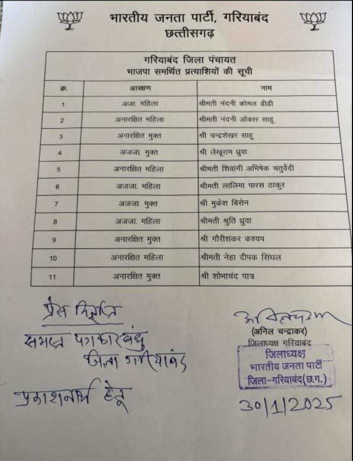 पुरुषोत्तम पात्र, गरियाबंद. भाजपा ने गरियाबंद जिले में त्रिस्तरीय पंचायत चुनाव के लिए प्रत्याशियों की लिस्ट जारी की है, जिसमें नए चेहरों को मौका दिया है. जिला पंचायत सदस्य प्रत्याशियों की सूची में चंद्रशेखर साहू को छोड़कर 10 नए प्रत्याशियों को टिकट दिया गया है. इस बार पार्टी ने गरियाबंद व देवभोग की महिला जनपद अध्यक्ष को जिला पंचायत से मैदान में उतारा है.