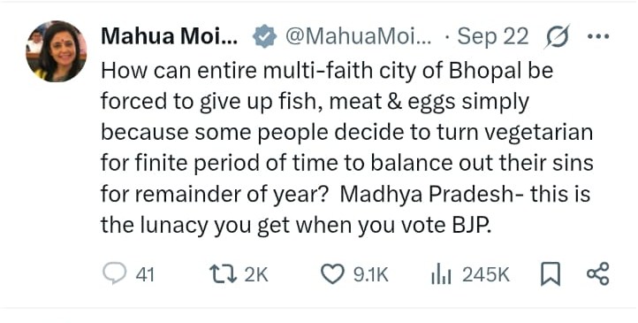 शब्बीर अहमद, भोपाल। मध्य प्रदेश की राजधानी भोपाल में मांस-मछली की दुकान बंद करने पर TMC सांसद महुआ मोइत्रा ने सवाल उठाए है। उन्होंने कहा कि कैसे पूरे बहु-धार्मिक शहर को मजबूर किया जा सकता है, क्यों कि कुछ लोग अपने पापों का प्रायश्चित करने के लिए कुछ समय के लिए शाकाहारी बनते है ?