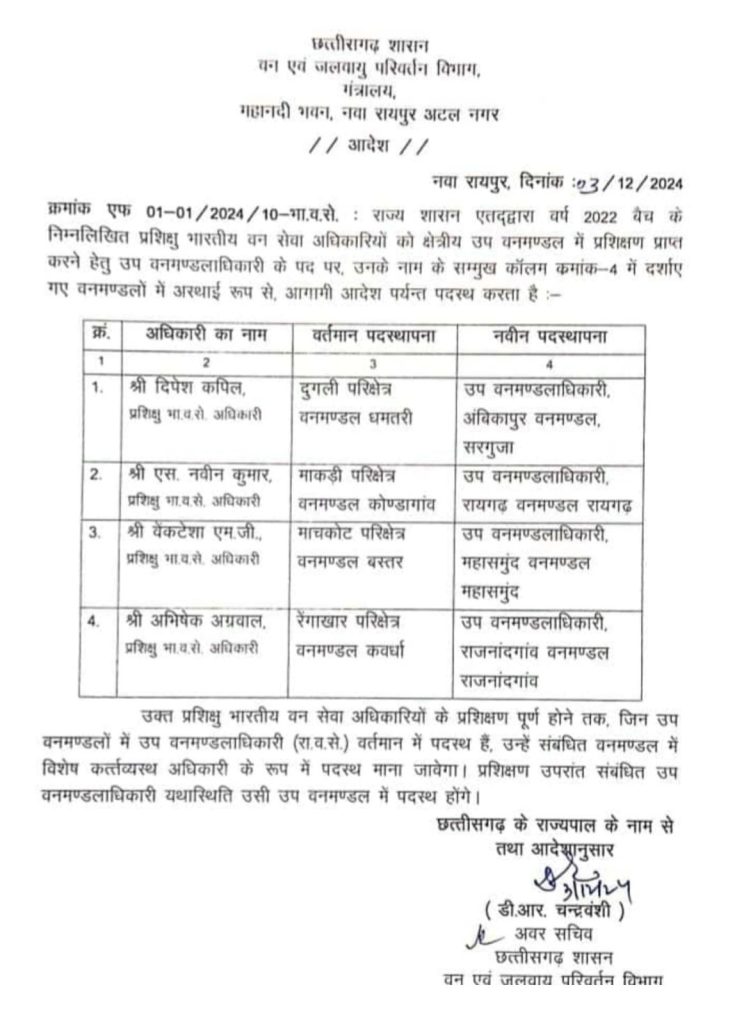 वन एवं जलवायु परिवर्तन विभाग के द्वारा जारी आदेश के मुताबिक प्रशिक्षु IFS दिपेश कपिल को अंबिकापुर उप वन मंडलाधिकारी बनाया गया है. एस नवीन कुमार को रायगढ़ उप वनमंडाधिकारी बनाया गया है. वेंकटेश एम जी को महासमुंद उप वनमंडलाधिकारी बनाया गया है. अभिषेक अग्रवाल को राजनांदगांव उप वनमंडलाधिकारी बनाया गया है.