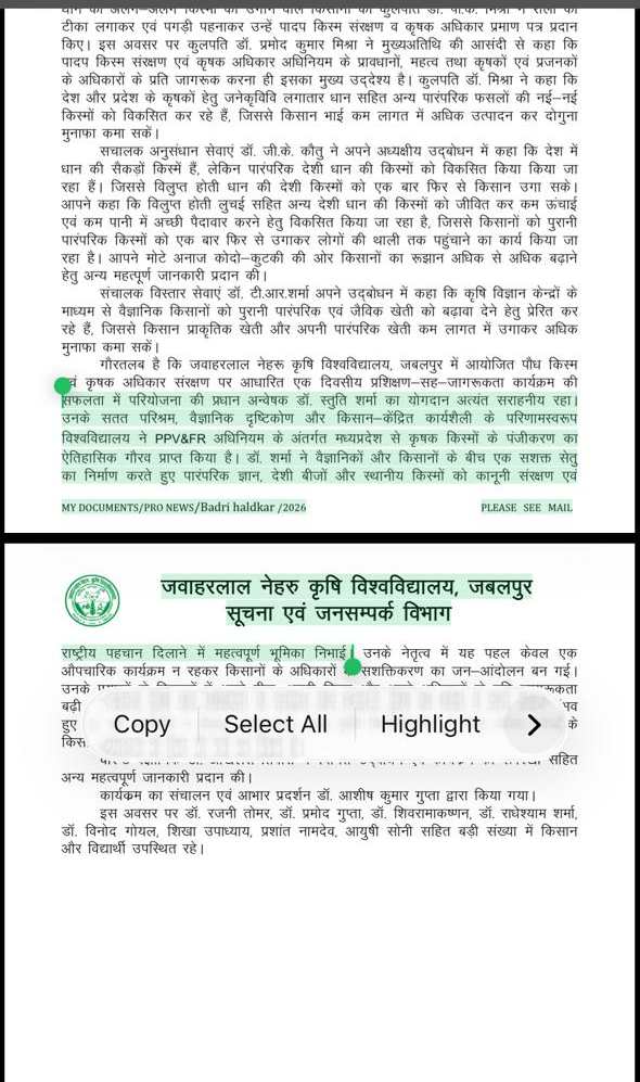 डॉ. टी.आर. शर्मा ने बताया कि कृषि विज्ञान केंद्रों के माध्यम से किसानों को प्राकृतिक और पारंपरिक खेती अपनाने के लिए प्रेरित किया जा रहा है, ताकि कम लागत में अधिक लाभ प्राप्त हो सके। डॉ. स्तुति शर्मा का योगदान अत्यंत सराहनीय रहा। उनके सतत परिश्रम, वैज्ञानिक दृष्टिकोण और किसान-केन्द्रित कार्यशैली के परिणामस्वरूप विश्वविद्यालय को पीपीवी एंड एफआर (पादप किस्म संरक्षण एवं कृषक अधिकार) अधिनियम के अंतर्गत मध्यप्रदेश से किसान किस्मों के पंजीकरण का ऐतिहासिक गौरव प्राप्त हुआ है।