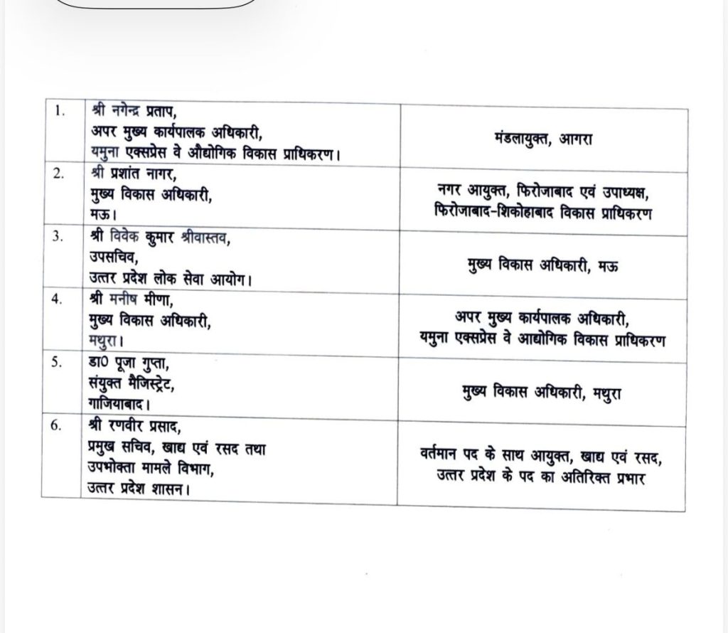 जारी सूची के मुताबिक नगेन्द्र प्रताप को आगरा मंडलायुक्त बनाया गया है. वहीं प्रशांत नागर को नगर आयुक्त, फिरोजाबाद और उपाध्यक्ष फिरोजाबाद-शिकोहाबाद विकास प्राधिकरण की जिम्मेदारी दी गई है. विवेक कुमार श्रीवास्तव का मऊ के मुख्य विकास अधिकारी के पद पर ट्रांसफर किया गया है.