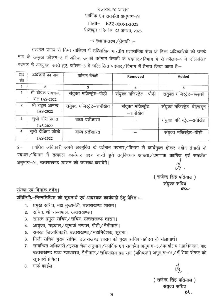 इसके अलावा दीक्षिता जोशी (IAS-2022) को संयुक्त मजिस्ट्रेट, पौड़ी के पद पर तैनात किया गया है. गौरी प्रभात (IAS-2022) को संयुक्त मजिस्ट्रेट, रानीखेत की जिम्मेदारी सौंपी गई है.