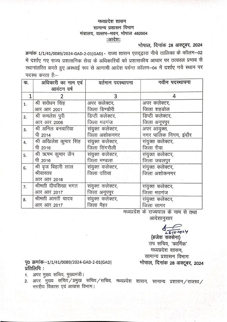 भोपाल। मध्य प्रदेश में देर रात बड़ा प्रशासनिक फेरबदल किया गया है। शासन ने राज्य प्रशासनिक सेवा के 8 अधिकारियों का तबादला कर दिया है। इस आदेश के बाद कई जिलों के डिप्टी कलेक्टर, अपर कलेक्टर और संयुक्त कलेक्टर बदल गए हैं। इसे लेकर सामान्य प्रशासन विभाग ने आदेश जारी कर दिया है।
