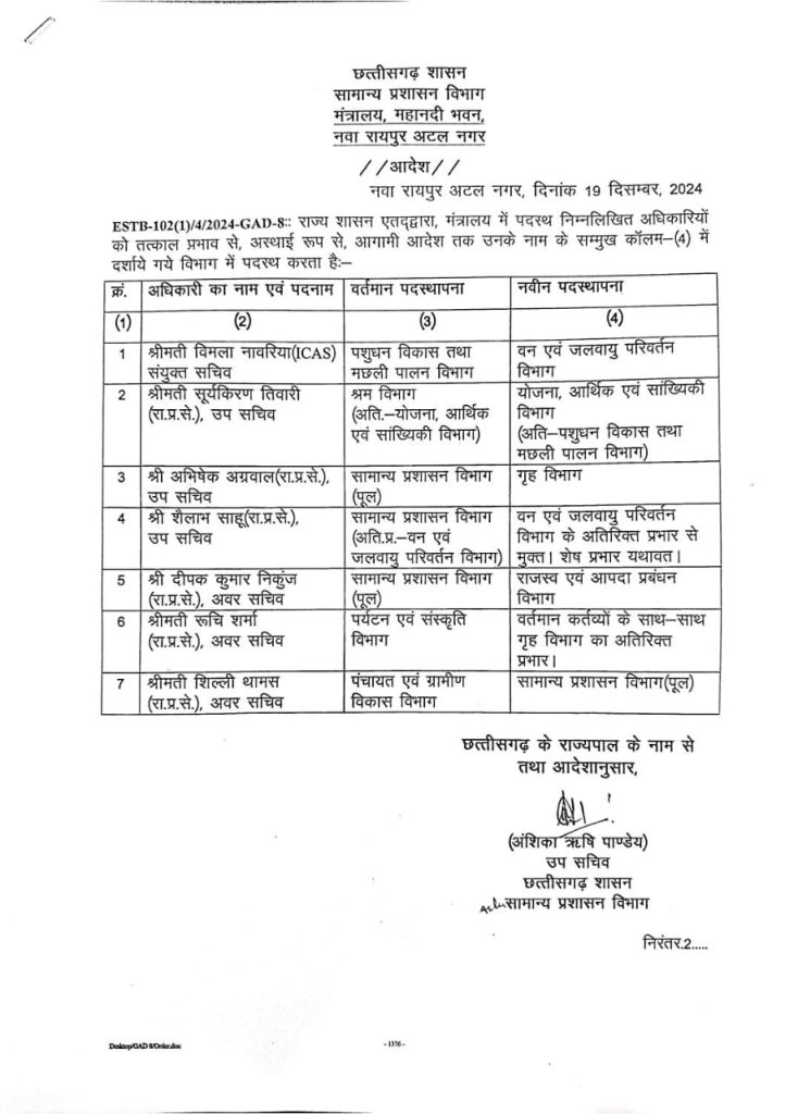 रायपुर. एक बार फिर से राज्य सरकार सरकार ने राज्य प्रशासनिक सेवा के अधिकारियों तबादला आदेश जारी किया है. सामान्य प्रशासन विभाग ने मंत्रालय में पदस्थ उप सचिव और अवर सचिव लेवल के अधिकारियों को इधर से उधर किया है. संयुक्त सचिव विमला नावरिया को पशुधन विकास तथा मछली पालन विभाग से हटाकर वन एवं जलवायु परिवर्तन विभाग में पदस्थ किया गया है. वहीं उपसचिव शैलाभ साहू को वन एवं जलवायु परिवर्तन विभाग के अतिरिक्त प्रभार से मुक्त किया गया है.