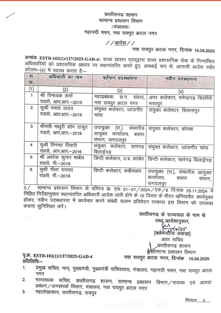 GAD द्वारा जारी आदेश के मुताबिक विनायक शर्मा को अपर कलेक्टर मनेंद्रगढ़ चिरमिरी भरतपुर बनाया गया है. ममता यादव को संयुक्त कलेक्टर बिलासपुर बनाया गया है. माधुरी सोम को संयुक्त कलेक्टर कोरबा बनाया गया है. स्निग्धा तिवारी को संयुक्त कलेक्टर जांजगीर चांपा बनाया गया है. अशोक मार्बल को डिप्टी कलेक्टर सारंगढ़-बिलाईगढ़ बनाया गया है.इसके अलावा गीता रायसत को उपायुक्त राजस्व संभागीय आयुक्त कार्यालय, बस्तर संभाग जगदलपुर भेजा गया है.