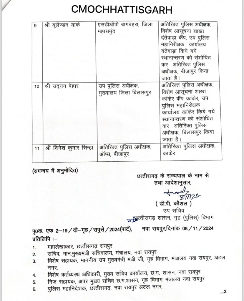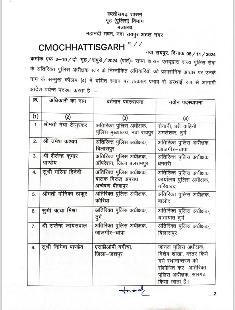 रायपुर. राज्य सरकार ने एक बार से बड़े पैमाने पर राज्य पुलिस सेवा के अधिकारियों का तबादला आदेश जारी किया है. राज्य सरकार ने कई जिलों के एडिशनल एसपी को बदल दिया है. गृह विभाग द्वारा जारी आदेश के मुताबिक बिलासपुर एडिशनल एसपी उमेश कश्यप को जांजगीर का एडिशनल एसपी बनाया गया है.
