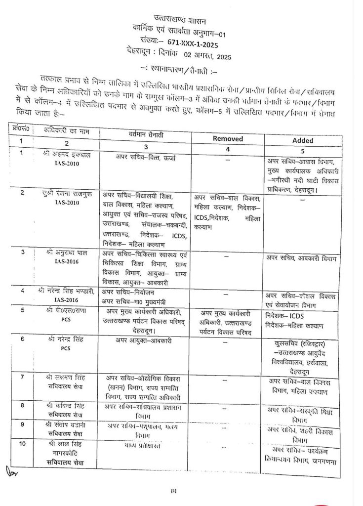 देहरादून. शनिवार को धामी सरकार ने 2022 बैच के 4 आईएएस अधिकारियों का तबादला किया. अब शासन ने भारतीय प्रशासनिक सेवा, प्रांतीय सिविल सेवा और सचिवालय सेवा के अधिकारियों की ट्रांसफर सूची जारी की है. सूची में 11 अफसरों के नाम शामिल हैं. कार्मिक एवं सतर्कता अनुभाग ने इस संबंध में आदेश जारी कर दिया है.