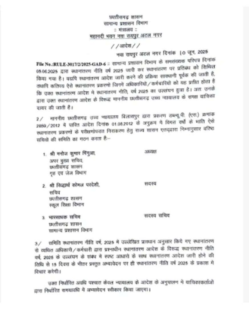 रायपुर। छत्तीसगढ़ में ट्रांसफर से बैन हटने के बाद तबादलों के लिए आवेदन आ रहे हैं. अधिकारियों, कर्मचारियों के ट्रांफसर अभ्यावेदनों की सुनवाई के लिए सरकार ने आईएएस मनोज कुमार पिंगुआ की अध्यक्षता में तीन सदस्यीय कमेटी का गठन किया है. इसका आदेश सामान्य प्रशासन विभाग ने जारी किया है.
