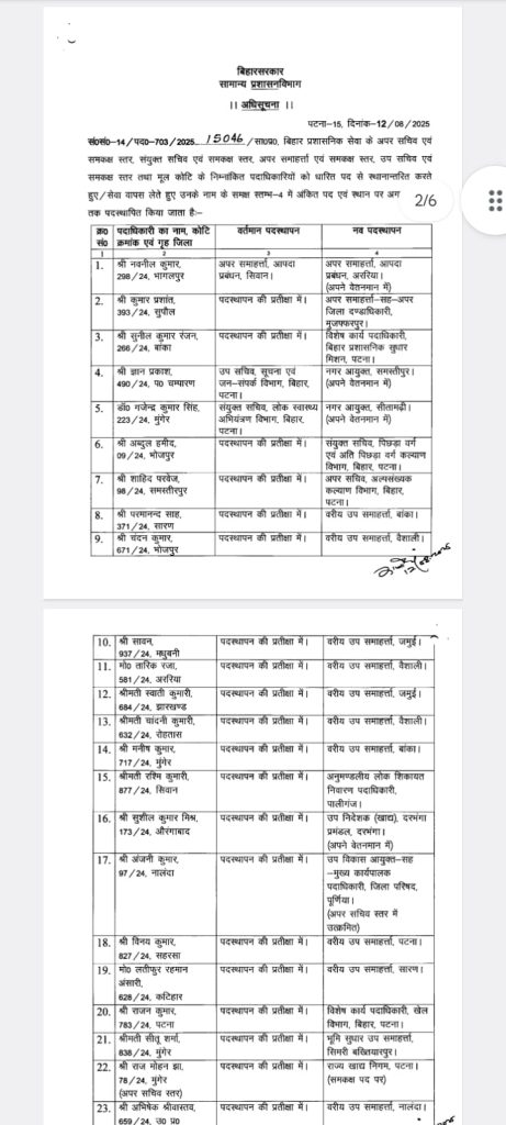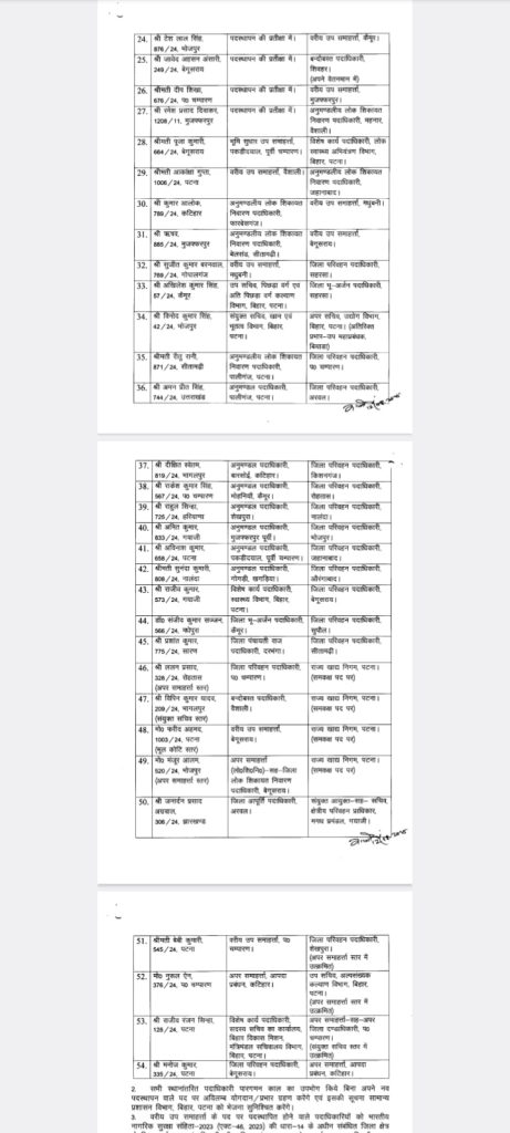 पटना। बिहार सरकार ने बिहार प्रशासनिक सेवा के 54 अधिकारियों का ट्रांसफर और पोस्टिंग किया है। सामान्य प्रशासन विभाग द्वारा इस संबंध में अधिसूचना जारी कर दी गई है। इस बदलाव में कई अधिकारी, जो पदस्थापन की प्रतीक्षा में थे, उन्हें नई जिम्मेदारी दी गई है।