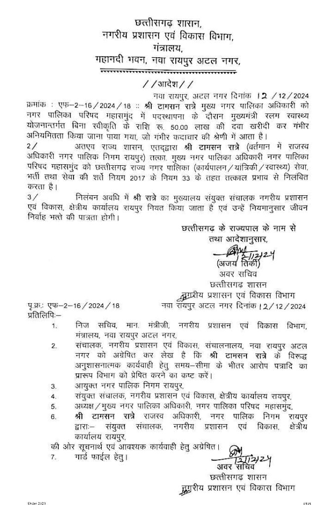 इसी तरह महासमुंद नगर पालिका के तत्कालीन मुख्य नगर पालिका अधिकारी टामसन रात्रे को बिना स्वीकृति 50 लाख रुपए की दवा खरीदी कर गंभीर अनियमितता बरते जाने का दोषी पाया गया है, जिस पर तत्काल प्रभाव से निलंबित करते हुए संयुक्त संचालक, नगरीय प्रशासन एवं विकास, क्षेत्रीय कार्यालय बिलासपुर मुख्यालय तय किया गया है.