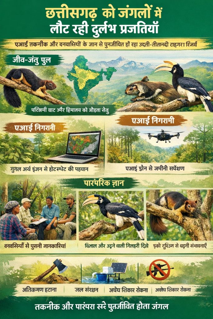आशुतोष तिवारी, जगदलपुर। छत्तीसगढ़ के घने जंगलों में एक दिलचस्प बदलाव दिखाई दे रहा है. यहाँ की पहाड़ियों और वनों में अब फिर से उन दुर्लभ प्रजातियों की आहट सुनाई देने लगी है, जो कभी पश्चिमी घाट और हिमालयी क्षेत्रों की पहचान मानी जाती थीं. मालाबार पाइड हॉर्नबिल, मालाबार विशाल गिलहरी और भारतीय उड़ने वाली गिलहरी जैसी प्रजातियाँ अब उदंती सीतानदी टाइगर रिजर्व में अपना विस्तार कर रही हैं. इस बदलाव के पीछे आधुनिक तकनीक और स्थानीय समुदायों के पारंपरिक ज्ञान का एक अनूठा संगम काम कर रहा है.