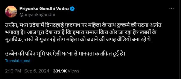 महिला से फुटपाथ पर दुष्कर्म मामले में प्रियंका गांधी वाड्रा ने सोशल मीडिया प्लेटफॉर्म पर चिंता जाहिर की है। उन्होंने लिखा, “उज्जैन, मध्य प्रदेश में दिनदहाड़े फुटपाथ पर महिला के साथ दुष्कर्म की घटना अत्यंत भयावह है। आज पूरा देश सन्न है कि हमारा समाज किस ओर जा रहा है? खबरों के मुताबिक, रास्ते से गुजर रहे लोग महिला को बचाने की जगह वीडियो बना रहे थे। उज्जैन की पवित्र भूमि पर ऐसी घटना से मानवता कलंकित हुई है।”