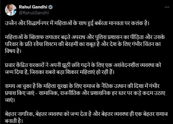 लोकसभा नेता प्रतिपक्ष राहुल गांधी ने भी सरकार पर जमकर हमला बोला। उन्होंने लिखा, “उज्जैन और सिद्धार्थनगर में महिलाओं के साथ हुई बर्बरता मानवता पर कलंक है। महिलाओं के खिलाफ लगातार बढ़ते अपराध और पुलिस प्रशासन का पीड़िता और उसके परिवार के प्रति रवैया सिस्टम की बेरहमी का सबूत है और देश के लिए गंभीर चिंतन का विषय है।”