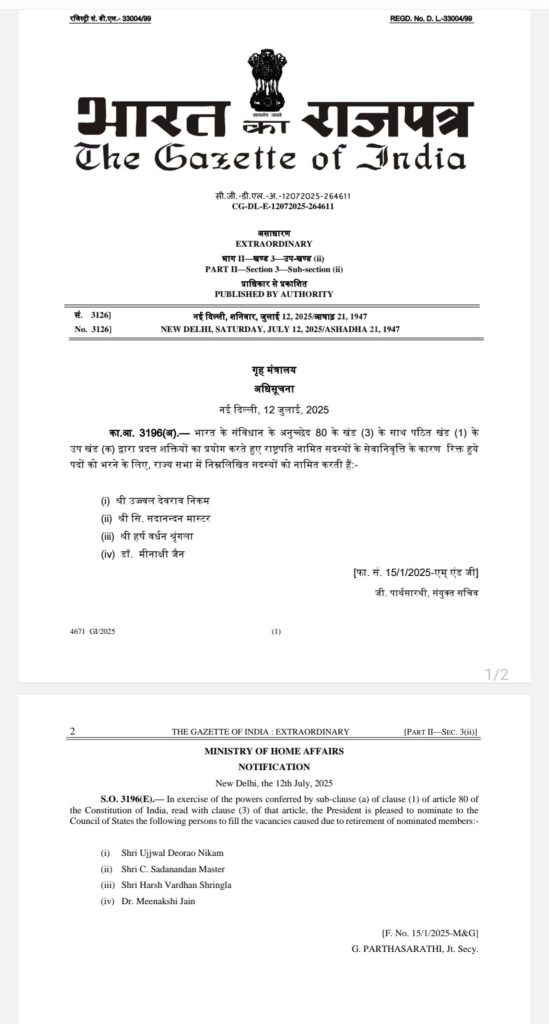 Ujjwal Nikam & Harsh Shringla Will Become Rajya Sabha MP: आतंकी कसाब को फांसी दिलाने वाले उज्जवल निकम राज्यसभा सांसद बनेंगे। निकम समेत पूर्व विदेश सचिव हर्षवर्धन श्रृंगला, केरल के वरिष्ठ सामाजिक कार्यकर्ता और शिक्षाविद् सी. सदानंदन मास्टर और प्रख्यात इतिहासकार तथा शिक्षाविद् मीनाक्षी जैन भी राज्यसभा सांसद बनेंगे। राष्ट्रपति द्रौपदी मुर्मू ने सभी को राज्यसभा के लिए मनोनीत किया है। गृह मंत्रालय ने यह अधिसूचना 12 जुलाई को जारी की थी।