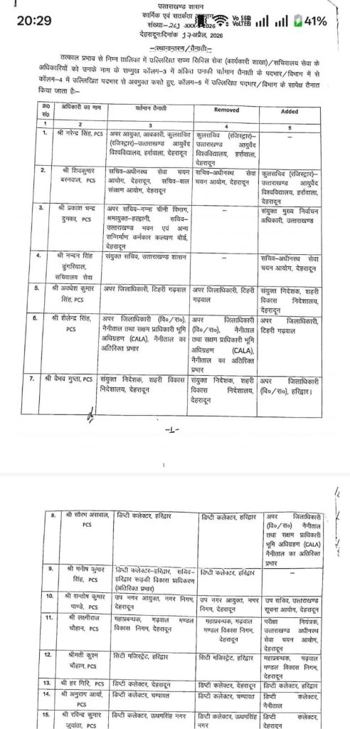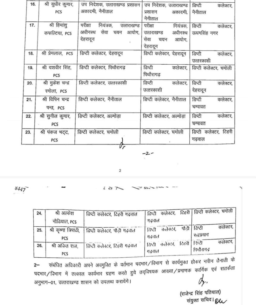 जारी अधिसूचना के मुताबिक रुचि मोहन से अपर आयुक्त नागरिक आपूर्ति चार्ज हटाया गया है। प्रकाश चंद्र से संयुक्त निर्वाचन अधिकारी का चार्ज हटाया गया है। वहीं गौरी प्रभात संयुक्त मजिस्ट्रेट पौड़ी गढ़वाल बनाई गई है। दीक्षिता जोशी संयुक्त मजिस्ट्रेट रानीखेत नियुक्त की गई है।