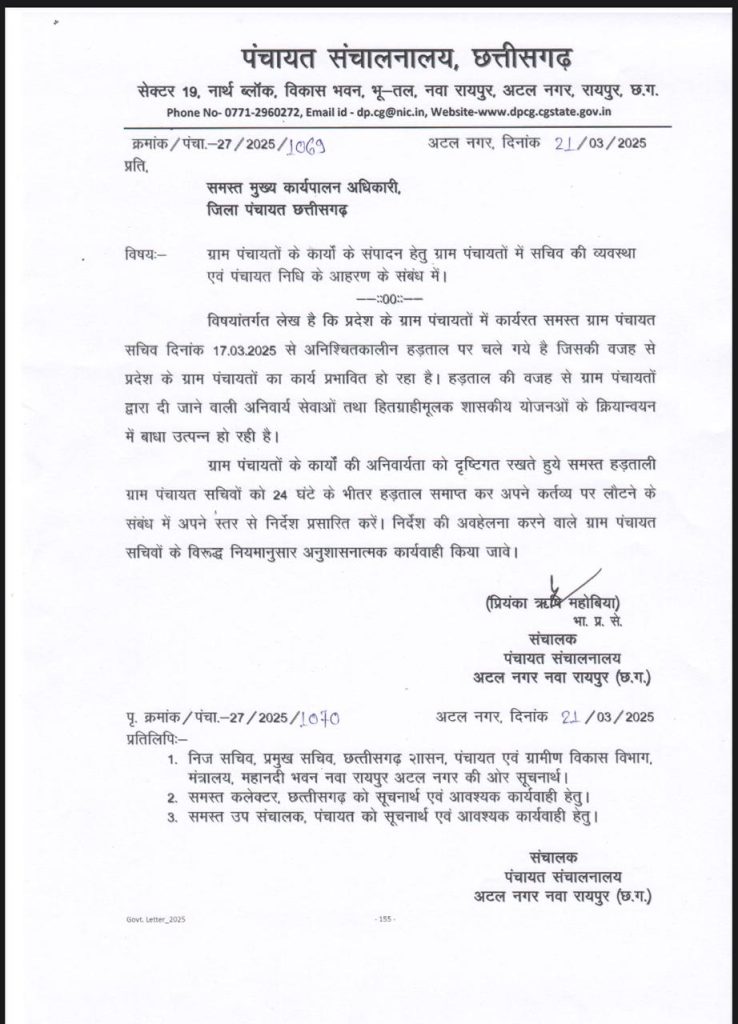संचालक ने पत्र के माध्यम से निज सचिव, प्रमुख सचिव, छत्तीसगढ़ शासन, पंचायत एवं ग्रामीण विकास विभाग, मंत्रालय, महानदी भवन नवा रायपुर को इसकी सूचना दी है. इसके साथ ही सभी कलेक्टरों को भी आवश्यक कार्यवाही के लिए सूचनार्थ के भेजा गया है.