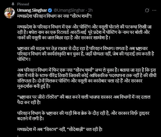 उमंग सिंघार ने सोशल मीडिया प्लेटफॉर्म एक्स पर लिखा, ‘मध्यप्रदेश के परिवहन विभाग में एक और पोस्टिंग और वसूली घोटाले की पटकथा लिखी जा रही है। बघेल नाम का एक रिटायर्ड आरटीआई पूरे प्रदेश में पोस्टिंग के नाम पर बोली और नाकों की वसूली का जाल बिछा रहा है और सरकार खामोश है। परिवहन विभाग भ्रष्टाचार की सड़क पर तेज रफ्तार से दौड़ रहा है। लगता है अब भ्रष्टाचार परिवहन विभाग की कार्य संस्कृति बन चुका है। जहां पोस्टिंग योग्यता नहीं, जेब की गहराई तय करती है।’