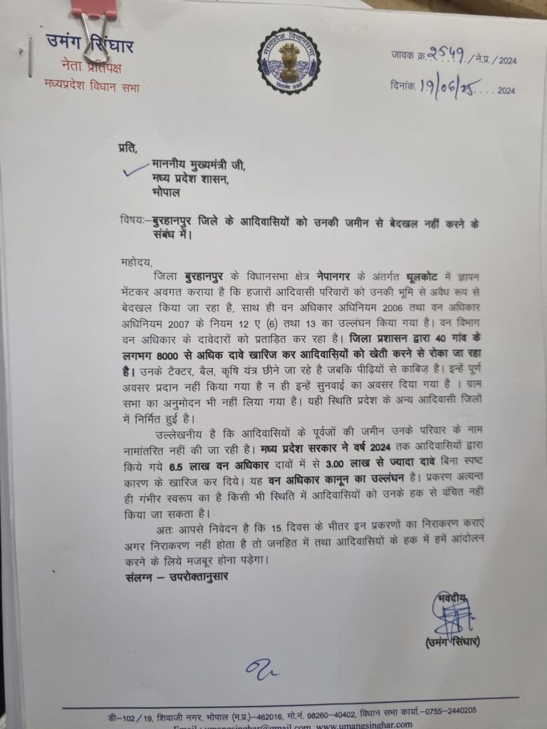 नेता प्रतिपक्ष उमंग सिंघार ने पीएम नरेंद्र मोदी और मध्य प्रदेधश के मुख्यमंत्री डॉ मोहन यादव को एक पत्र लिखा है। जिसमें उन्होंने कहा कि ‘जिला बुरहानपुर के विधानसभा क्षेत्र नेपानगर के अंतर्गत धूलकोट में ज्ञापन भेंटकर अवगत कराया है कि हजारों आदिवासी परिवारों को उनकी भूमि से अवैध रूप से बेदखल किया जा रहा है, साथ ही वन अधिकार अधिनियम 2006 तथा वन अधिकार अधिनियम 2007 के नियम 12 ए (6) तथा 13 का उल्लंघन किया गया है।’