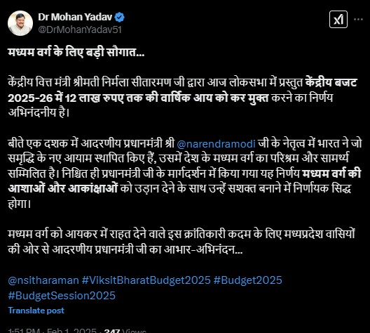 सीएम डॉ. मोहन यादव ने 12 लाख की इनकम पर टैक्स में छूट देने के फैसले पर केंद्रीय वित्त मंत्री का आभार व्यक्त किया है। उन्होंने कहा, “केंद्रीय वित्त मंत्री निर्मला सीतारमण द्वारा आज लोकसभा में प्रस्तुत केंद्रीय बजट 2025-26 में 12 लाख रुपए तक की वार्षिक आय को कर मुक्त करने का निर्णय अभिनंदनीय है। बीते एक दशक में प्रधानमंत्री नरेंद्र मोदी के नेतृत्व में भारत ने जो समृद्धि के नए आयाम स्थापित किए हैं, उसमें देश के मध्यम वर्ग का परिश्रम और सामर्थ्य सम्मिलित है। निश्चित ही प्रधानमंत्री के मार्गदर्शन में किया गया यह निर्णय मध्यम वर्ग की आशाओं और आकांक्षाओं को उड़ान देने के साथ उन्हें सशक्त बनाने में निर्णायक सिद्ध होगा। मध्यम वर्ग को आयकर में राहत देने वाले इस क्रांतिकारी कदम के लिए मध्यप्रदेश वासियों की ओर से आदरणीय प्रधानमंत्री जी का आभार-अभिनंदन।”