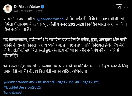 सीएम ने सोशल मीडिया प्लेटफॉर्म एक्स पर पोस्ट कर लिखा, “प्रधानमंत्री नरेंद्र मोदी के मार्गदर्शन में केंद्रीय वित्त मंत्री निर्मला सीतारमण के प्रस्तुत केंद्रीय बजट 2025-26 विकसित भारत के संकल्पों को सिद्ध करने वाला है। यह कल्याणकारी, सर्वस्पर्शी और समावेशी बजट देश के गरीब, युवा, अन्नदाता और नारी शक्ति के समग्र विकास के साथ स्टार्टअप्स, इनोवेशन तथा आर्टिफिशियल इंटेलिजेंस जैसे विभिन्न क्षेत्रों को समाहित करते हुए, अंत्योदय की भावना और नवोन्मेष की नव-दृष्टि से परिपूर्ण है। 140 करोड़ देशवासियों के कल्याण तथा भारत को आत्मनिर्भर बनाने वाले इस बजट के लिए प्रधानमंत्री और केंद्रीय वित्त मंत्री का हार्दिक अभिनंदन।”