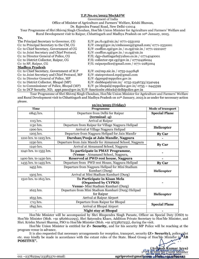 लोक निर्माण विभाग रेस्टहाउस में दोपहर 2.00 से 2.30 तक आरक्षित है. दोपहर 2.35 को नगपुरा हेलीपेड के लिए रवाना होंगे. कुम्हारी के मिनी स्टेडियम में दोपहर 3.10 से 4.15 बजे तक “किसान मेला” कार्यक्रम में शिरकत करेंगे. विभिन्न कार्यक्रमों में शामिल होने के बाद शाम 5.15 को भोपाल के लिए रवाना होंगे.