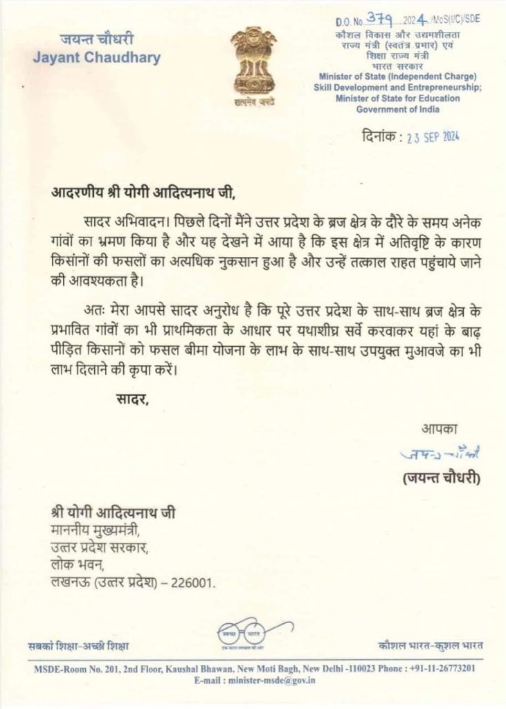 केंद्रीय मंत्री जयंत चौधरी ने उत्तर प्रदेश के मुख्यमंत्री योगी आदित्यनाथ को एक पत्र लिखकर अतिवृष्टि से प्रभावित किसानों की फसलों के नुकसान के संबंध में चिंता व्यक्त की है. उन्होंने खासकर ब्रज क्षेत्र के किसानों को राहत देने की मांग की है, जो हाल ही में बाढ़ और बारिश के कारण कठिनाईयों का सामना कर रहे हैं.