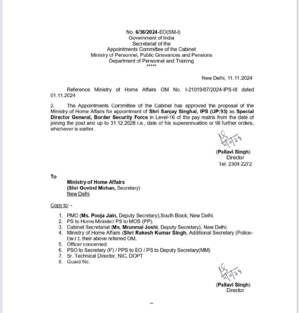 आदेश के मुताबिक आईपीएस संजय सिंघल को बीएसएफ के वेतन मैट्रिक्स के लेवल-16 में तैनात किया गया है. वह पदभार ग्रहण करने की तिथि से 31 दिसंबर 2028 यानी सेवानिवृत्ति तक या अगले आदेश तक सीमा सुरक्षा बल के विशेष महानिदेशक के रूप में बने रहेंगे.