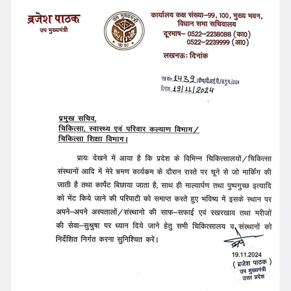 जिसमें उन्होंने कहा कि ‘प्राय: देखने में आया है कि प्रदेश के विभिन्न चिकित्सालयों/चिकित्सा संस्थानों आदि में मेरे भ्रमण कार्यक्रम के दौरान रास्ते पर चूने से जो मार्किंग की जाती है तथा कार्पेट बिछाया जाता है। साथ ही माल्यार्पण तथा पुष्पगुच्छ इत्यादि को भेंट किये जाने की परिपाटी को समाप्त करते हुए भविष्य में इसके स्थान पर अपने-अपने अस्पतालों/संस्थानों की साफ सफाई एवं रखरखाव तथा मरीजों की सेवा सुश्रुषा पर ध्यान दिये जाने हेतु सभी चिकित्सालय व संस्थानों को निर्देशित निर्गत करना सुनिश्चित करें।’
