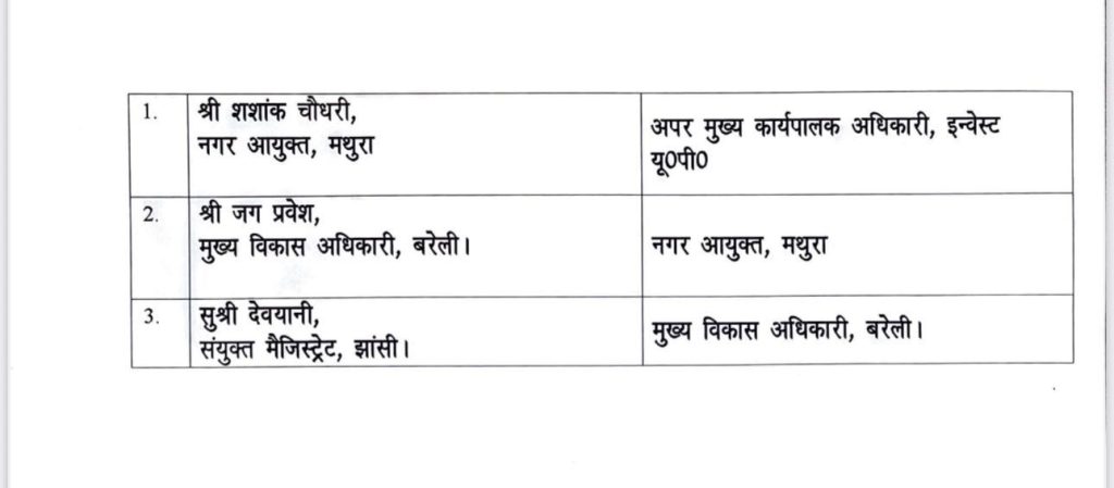वहीं बरेली के मुख्य विकास अधिकारी जग प्रवेश को मथुरा का नगर आयुक्त बना दिया गया है. इनकी जगह पर झांसी की संयुक्त मजिस्ट्रेट देवयानी को बरेली का मुख्य विकास अधिकारी बनाया गया है.