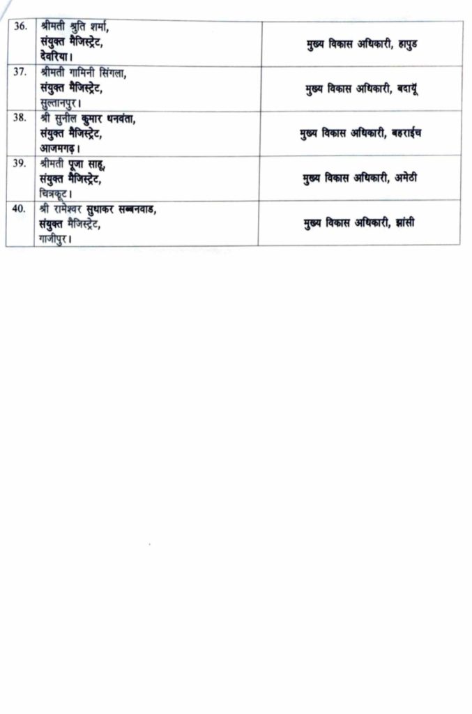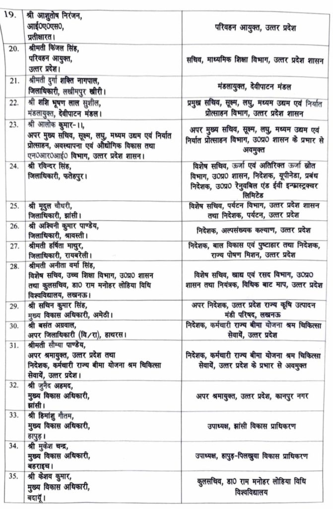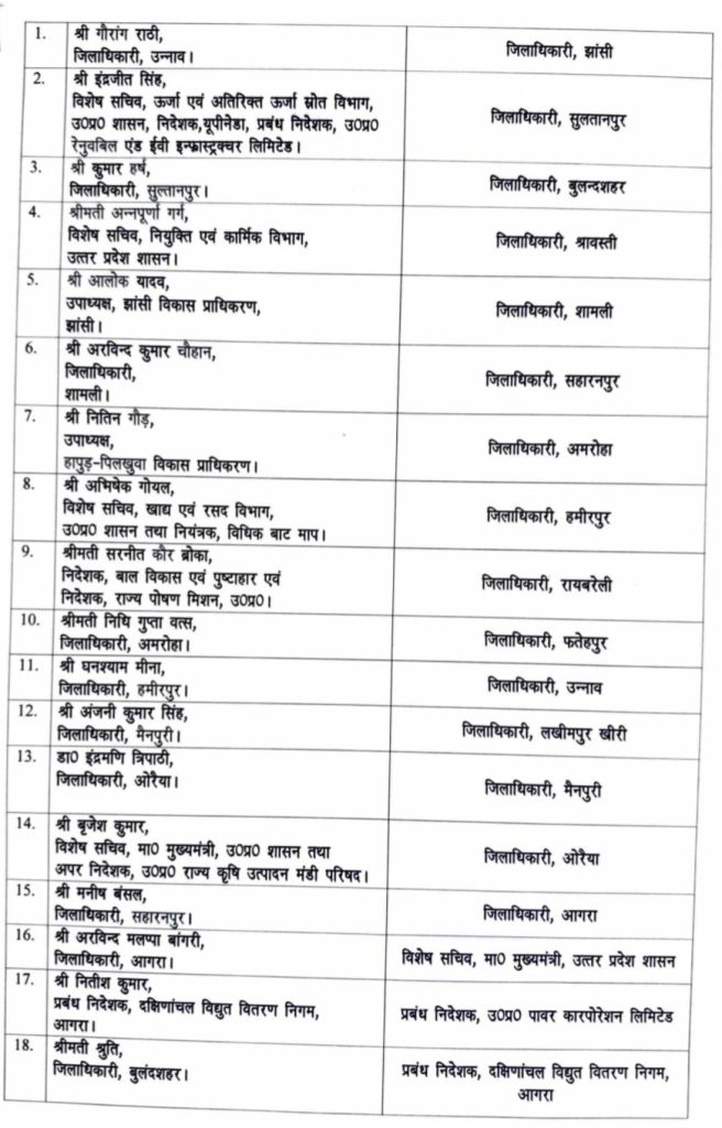 आगरा के डीएम अरविंद मल्लप्पा बांगरी को मुख्यमंत्री का विशेष सचिव बनाया गया है। बुलंदशहर की डीएम श्रीमती श्रुति को दक्षिणांचल विद्युत वितरण निगम का एमडी बनाया गया है। फतेहपुर के डीएम रविंद्र सिंह को ऊर्जा एवं अतिरिक्त ऊर्जा स्रोत का विशेष सचिव बनाया गया है। झांसी के डीएम मृदुल चौधरी को पर्यटन विभाग का विशेष सचिव