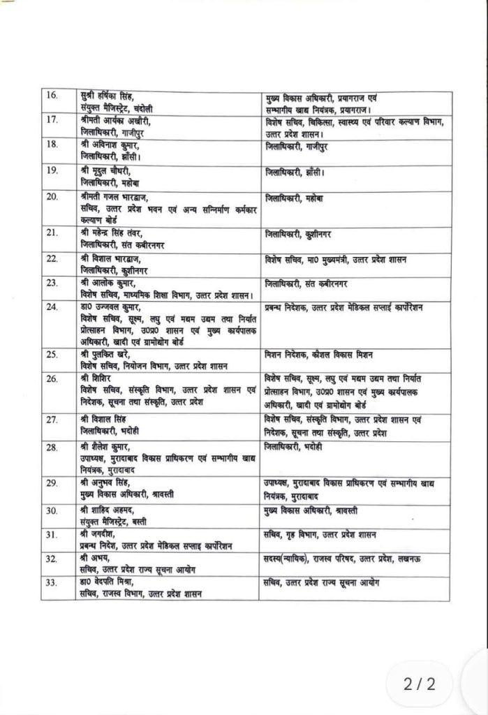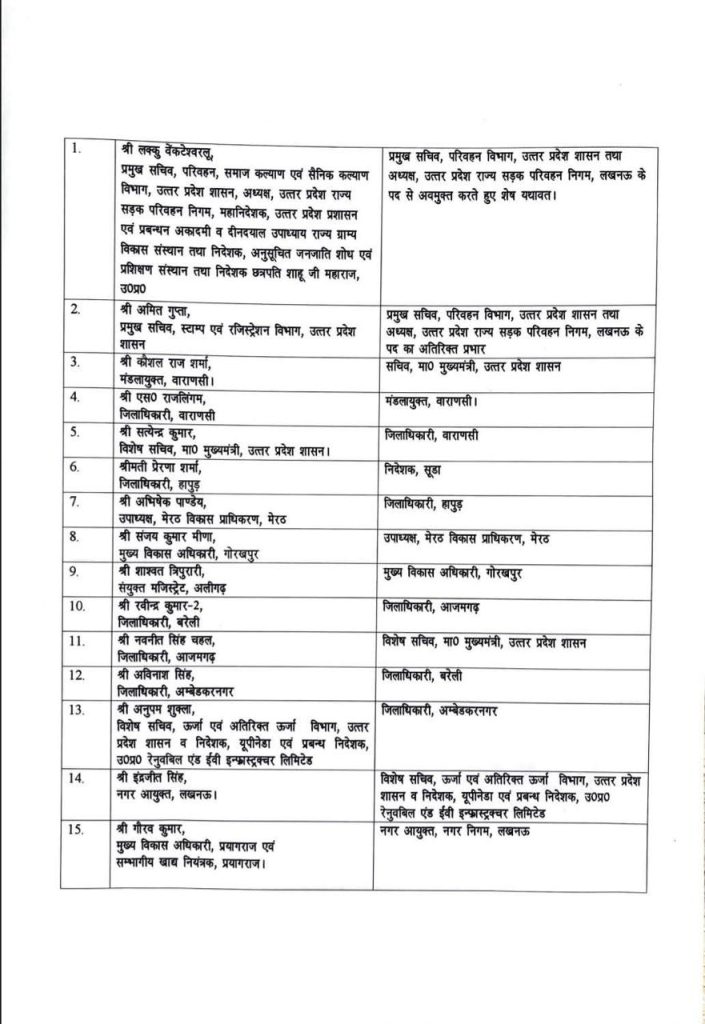इसके अलावा जिलाधिकारी बरेली रविंद्र कुमार 2 को जिलाधिकारी आजमगढ़, जिलाधिकारी नवनीत सिंह चहल आजमगढ़ को विशेष सचिव मुख्यमंत्री, जिलाधिकारी अंबेडकर नगर अविनाश सिंह को जिलाधिकारी बरेली, विशेष सचिव ऊर्जा एवं अतिरिक्त ऊर्जा अनुपम शुक्ला को जिलाधिकारी अंबेडकर नगर, नगर आयुक्त इंद्रजीत सिंह को विशेष सचिव ऊर्जा एवं अतिरिक्त ऊर्जा, विकास अधिकारी प्रयागराज गौरव कुमार को नगर आयुक्त नगर निगम लखनऊ, संयुक्त मजिस्ट्रेट चंदौली हर्षिका सिंह को मुख्य विकास अधिकारी प्रयागराज बनाया गया है.