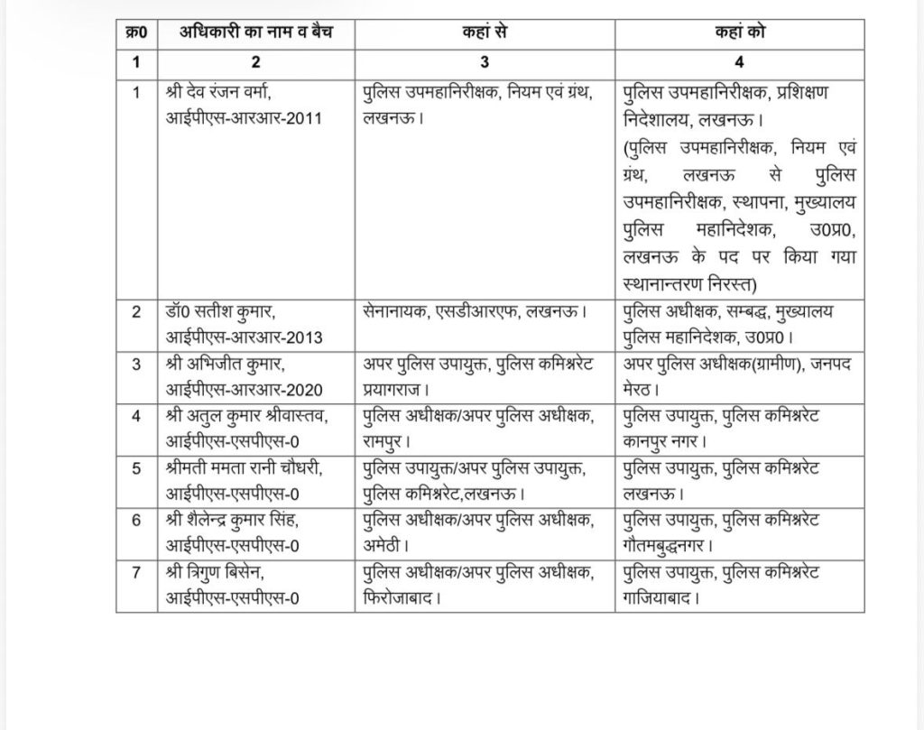 UP IPS OFFICER TRANSFER: उत्तर प्रदेश में एक बार फिर तबादला एक्सप्रेस चली है। योगी सरकार ने प्रदेश के 7 आईपीएस अफसरों का ट्रांसफर कर दिया है। कानून व्यवस्था को दुरूस्त करने के लिए यह कदम उठाया गया है। इस संबंध में यूपी पुलिस विभाग ने अधिसूचना भी जारी कर दी है। जारी आदेश के मुताबिक ममता रानी चौधरी को डीसीपी लखनऊ कमिश्नरेट बनाया गया है।