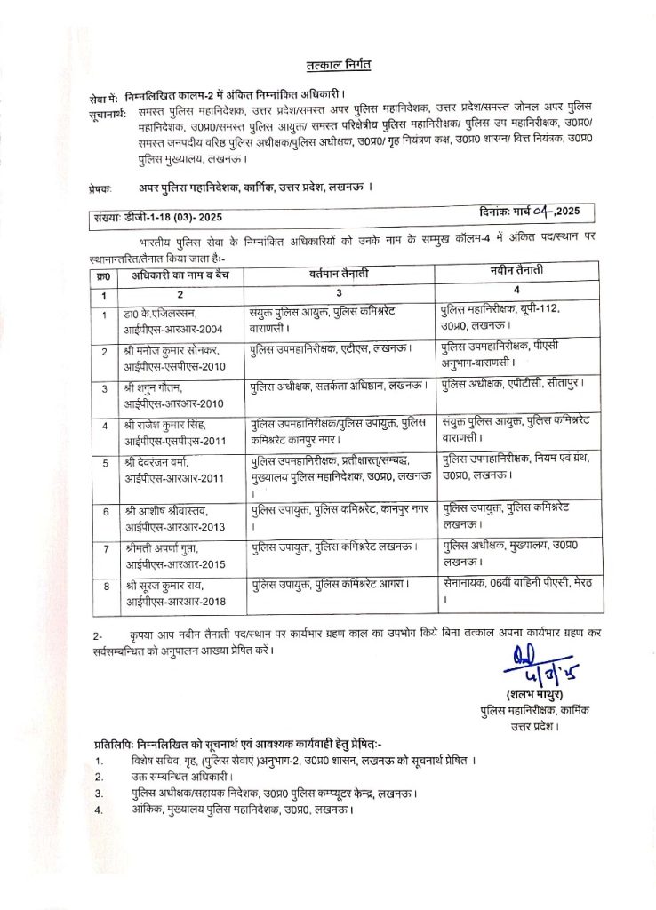 इसके अलावा के एजिल रसन को आईजी डायल 112 लखनऊ, शगुन गौतम एसपी पीटीसी सीतापुर, राजेश कुमार सिंह को ज्वॉइंट सीपी वाराणसी की जिम्मेदारी सौंपी गई है. वहीं देवरंजन वर्मा डीआईजी रूल मैनुअल, आशीष श्रीवास्तव DCP पुलिस कमिश्नरेट लखनऊ, अपर्णा गुप्ता डीजीपी हेडक्वार्टर से अटैच और सूरज कुमार राय सेनानायक 6 वाहिनी PAC मेरठ की जिम्मेदारी दी गई है.