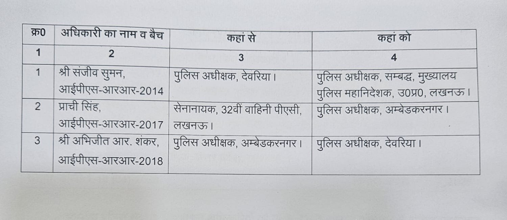 UP IPS TRANSFER: उत्तर प्रदेश में एक बार फिर तबादला एक्सप्रेस चली है। कानून व्यवस्था को दुरुस्त रखने के लिए योगी सरकार ने 3 आईपीएस अफसरों का ट्रांसफर किया है। जिसके मुताबिक प्राची सिंह एसपी अंबेडकरनगर बनाई गई है। देवरिया एसपी संजीव सुमन हटाए गए है। उन्हें पुलिस मुख्यालय से अटैच किया गया है। वहीं अभिजीत शंकर को देवरिया का नया एसपी बनाया गया है।