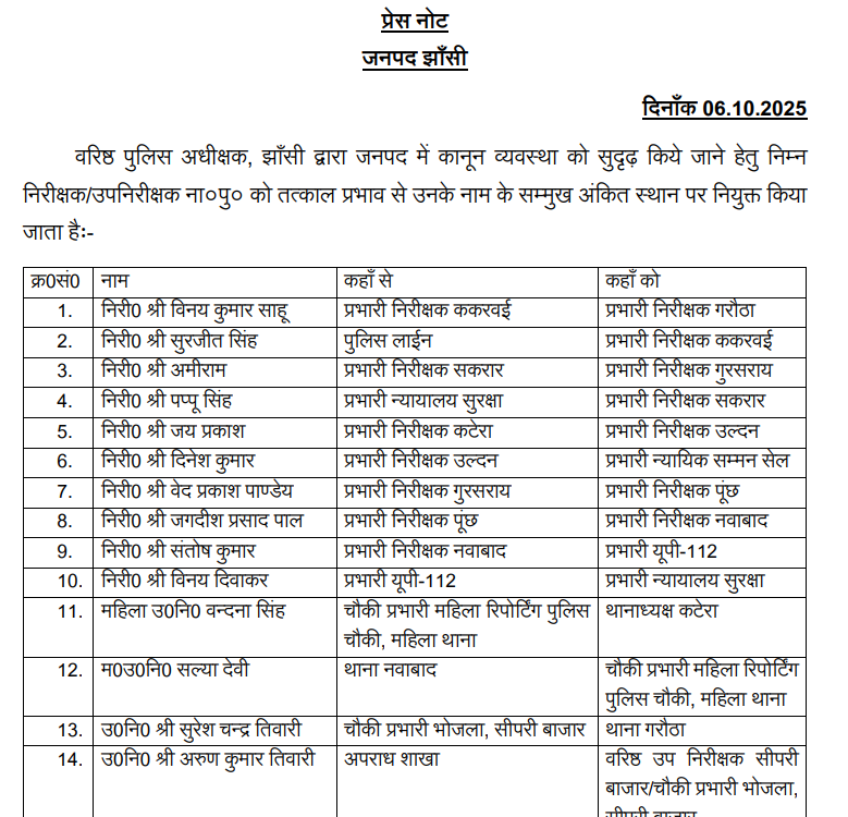 झांसी। उत्तर प्रदेश में एक बार फिर तबादला एक्सप्रेस चली है। SSP बीबीजीटीएस मूर्ति ने 14 पुलिस कर्मियों के कार्यक्षेत्र में बड़ा बदलाव किया है। जारी आदेश के मुताबिक विनय कुमार साहू गरौठा थाना प्रभारी होंगे। सुरजीत सिंह प्रभारी निरीक्षक ककरवई बनाए गए। जबकि पप्पू सिंह अब सकरार का चार्ज संभालेंगे। कानून व्यवस्था को दुरूस्त करने के लिए SSP बीबीजीटीएस मूर्ति ने यह कदम उठाया गया है।