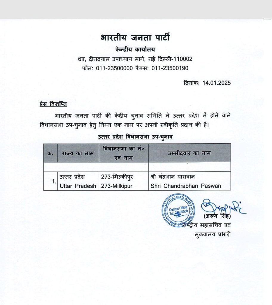 लखनऊ. 5 फरवरी को मिल्कीपुर सीट पर उपचुनाव होना है. ऐसे में भाजपा ने इस सीट पर अपने प्रत्याशी का ऐलान कर दिया है. भाजपा ने चंद्रभान पासवान को मिल्कीपुर से अपना प्रत्याशी बनाया है. ऐसे में अब चंद्रभान पासवान VS अजीत प्रसाद के बीच कांटे की टक्कर देखने को मिलेगा.