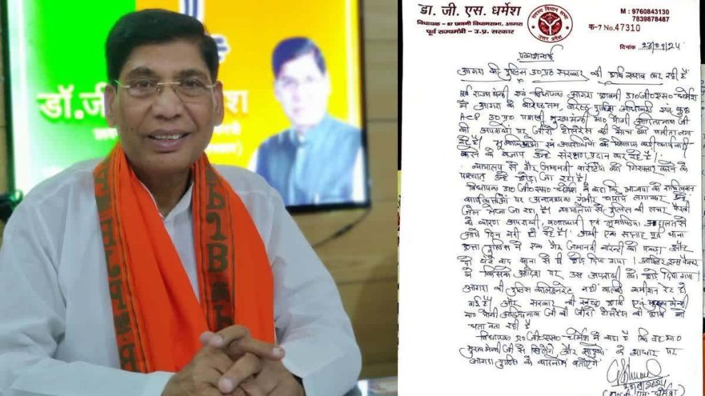 आगरा. भाजपा विधायक डाॅ. जीएस धर्मेश ने अपनी ही सरकार के कमिश्नरेट पुलिस पर गंभीर आरोप लगाते हुए मोर्चा खोल दिया है. उन्होंने प्रेस नोट जारी कर पुलिस पर भाजपा कार्यकर्ताओं के खिलाफ कार्रवाई करने और भूमाफिया को संरक्षण देने का आरोप लगाया है.