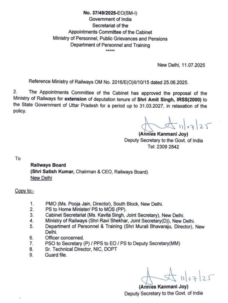 लखनऊ। मुख्यमंत्री योगी आदित्यनाथ के सचिव अमित सिंह की प्रतिनियुक्ति अवधि एक बार फिर बढ़ा दी गई है। अब वे 31 मार्च 2027 तक इस पद पर बने रहेंगे। 2000 बैच के भारतीय रेल सेवा (IRSS) के अधिकारी अमित सिंह वर्तमान में मुख्यमंत्री सचिव के रूप में कार्यरत हैं।